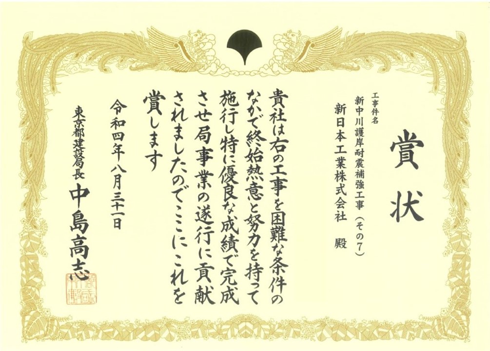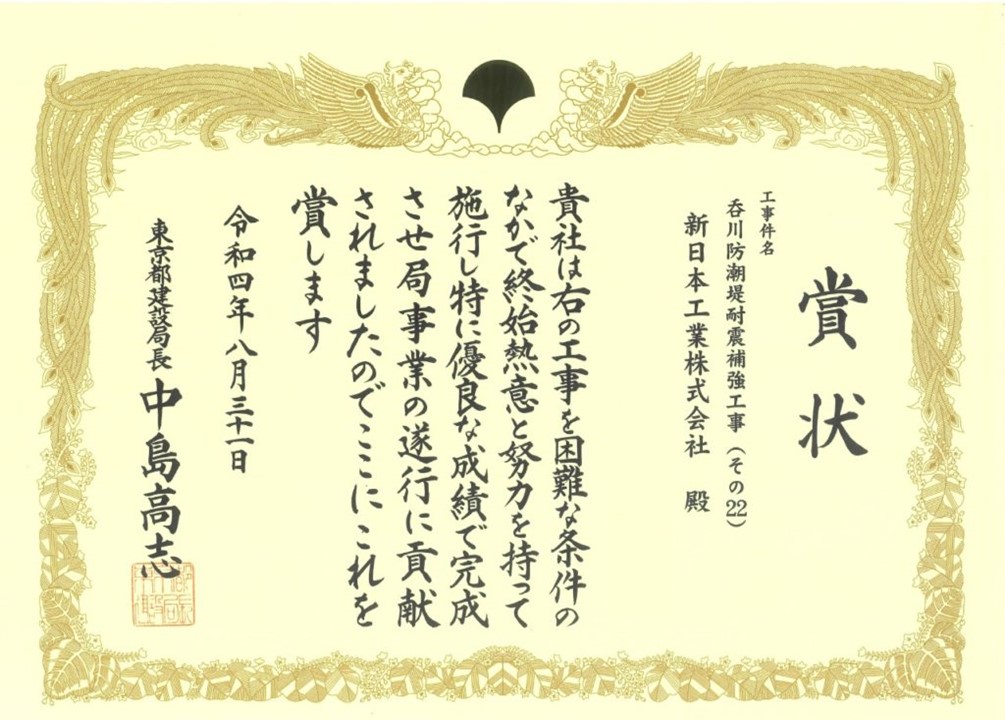 弊社元請工事にて、発注者の東京都建設局様より工事表彰をいただきました。工事件名:呑川防潮堤耐震補強工事(その22)